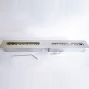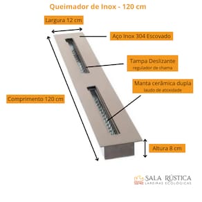 MODELO QUEIMADOR 120CM - Área de aquecimento : 70m² - Quantidade álcool no reservatório: 2,5L (cada reservatório) - Espessura chapa: 3mm - Modelo da tampa: Com regulagem para chama - Acabamento do tampo: Aço inox escovado - Dimensões: 14cm (largura) x 120cm (comprimento) x 08cm (altura) - Tempo de aquecimento estimado: 1,5h à 2,5h - Material do queimador: INOX 304 - Recorte no nicho para instalação: 12cm x 116cm - Revestimento interno: Manta cerâmica