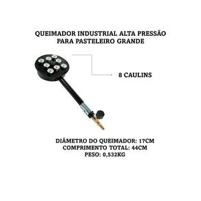 Queimador Industrial Longo com 8 Caulins para Pasteleiro Grande.Marca: RoaLinha: Queimador para PasteleiroCor: Preto - Pintura EletrostáticaCaulins (chuveirinho onde sai a chama): 08Funcionamento: Gás de Cozinha (GLP)Diâmetro: 17 cmComprimento total: 44cmPeso: 0,53kgModelos compatíveis: Fogão Pasteleiro Grande da marca ROA.