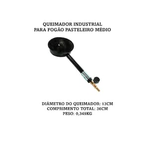 Queimador Industrial para Pasteleiro Médio com Registro Alta Pressão e sem caulinsMarca: RoaLinha: Queimador para PasteleiroCor: Preto - Pintura EletrostáticaFuncionamento: Gás GLPDiâmetro do queimador: 130mmComprimento total: 360mmPeso: 0,349 KgModelos compatíveis: Fogão Pasteleiro Médio da marca ROA.