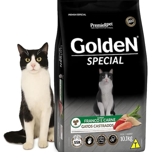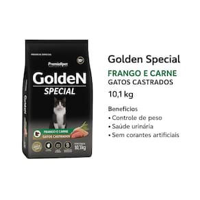 Ração Golden Special Gatos Castrados 10,1kg Frango Carne Ração Golden Special Gatos Castrados Sabor Frango e Carne 10,1kg A Ração Golden Special Gatos Castrados é desenvolvida especialmente para atender as necessidades nutricionais de gatos adultos castrados. Sua fórmula completa e balanceada oferece o equilíbrio ideal entre sabor e saúde, garantindo uma alimentação de qualidade premium para o seu pet. Com proteínas de alta qualidade, como frango e carne, esse alimento auxilia na manutenção da massa muscular, promove energia e contribui para a saúde geral do gato. Além disso, contém ingredientes selecionados que ajudam no controle do peso, fundamental para gatos castrados, que tendem a ter metabolismo mais lento. A Golden Special também contribui para a saúde intestinal, proporcionando fezes com melhor consistência e menor odor, e auxilia na saúde da pele e dos pelos, deixando-os mais bonitos e brilhantes. Benefícios da Ração Golden Special Gatos Castrados 10,1kg: