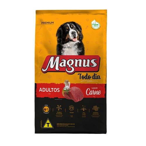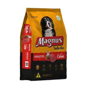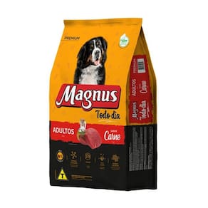 Ração Magnus Premium  Todo Dia Cães Adultos Carne - 10,1Kg- Indicado para cães adultos;- Bio complex;- Sem corantes Artificiais;- Nutritiva e saborosa;- Ômegas 3 e 6 , biotina e zinco orgânico;- Rico em vitaminas e proteínas.A Ração Magnus Premium é um alimento completo para cães adultos, produzida com ingredientes selecionados, com vitaminas e proteínas,fornecendo benefícios necessários para o seu cão.Ração rica em ômegas 3 e 6, Biotina e Zinco Quelato que são importantes nutrientes para a manutenção da pelagem sedosa e brilhante.Possui Prebiótico, Fibras e Extrato de Yucca, sendo ingredientes que promovem o equilíbrio da flora intestinal com fezes mais firmes e com menos odor. Além de proteínas de alta qualidade, as Rações Magnus Premium auxilia na limpeza dental dos cães com Hexametafosfato de sódio. IngredientesMilho moído, farinha de carne e osso de bovinos, farelo de soja, farelo de trigo, óleo de aves, hidrolisado de fígado de aves e miúdos de suínos, cloreto de sódio, parede celular de levedura, corante caramelo IV, extrato de yucca, vitaminas, minerais, ácido propiônico, BHA (Butilhidroxianisol) e BHT (Butilhidroxitolueno). Eventuais substitutivos: Farelo de arroz, quirera de arroz, gérmen de milho, hidrolisado de miúdos de aves, farinha de carne e ossos de suínos.