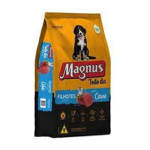 Ração Magnus Premium Todo Dia Cães Filhotes Carne - 20Kg - Indicado para cães filhotes;- Bio Complex;- Sem corantes Artificiais;- Nutritiva e saborosa;- Ômegas 3 e 6 , biotina e zinco orgânico;- Rico em vitaminas e proteínas.A Ração Magnus Premium é um alimento completo para cães filhotes, produzida com ingredientes selecionados, com vitaminas e proteínas,fornecendo benefícios necessários para o seu cão.Ração rica em ômegas 3 e 6, Biotina e Zinco Quelato que são importantes nutrientes para a manutenção da pelagem sedosa e brilhante.Possui Prebiótico, Fibras e Extrato de Yucca, sendo ingredientes que promovem o equilíbrio da flora intestinal com fezes mais firmes e com menos odor. Além de proteínas de alta qualidade, as Rações Magnus Premium auxilia na limpeza dental dos cães com Hexametafosfato de sódio.   IngredientesMilho moído, farinha de carne e ossos de bovino, farelo de trigo, farelo de soja, farinha de vísceras de aves, óleo de aves, cloreto de sódio, parede celular de levedura, hidrolisado de fígado de aves e miúdos de suínos, linhaça, polpa de beterraba, extrato de yucca, vitaminas, minerais, ácido propiônico, BHA (Butilhidroxianisol) e BHT (Butilhidroxitolueno). Eventuais substitutivos: Farelo de arroz, farinha de carne e ossos de aves, quirera de arroz, hidrolisado de miúdos de aves, farinha de carne e ossos de suínos.