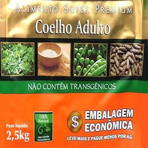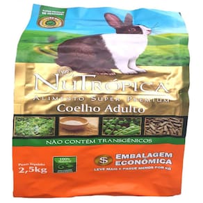 Ração Nutrópica Coelho Adulto 2,5Kg Indicação do Produto: Nutrópica Coelho Adulto é um alimento extrusado completo, cientificamente formulado e especialmente desenvolvido para coelhos a partir dos 9 meses de idade. Cada embalagem de NuTrópica Coelho Adulto contém uma combinação exclusiva das mais nobres e saborosas matérias-primas não transgênicas, preparadas sob rigoroso controle de qualidade e utiliza as melhores técnicas em produção de alimentos. São mais de 30 ingredientes diferentes, incluindo alfafa e vários tipos de grãos integrais como aveia, ervilha, linhaça e trigo, que juntos proporcionam os níveis ideais dos nutrientes necessários para a perfeita saúde, beleza, bem-estar e vitalidade do seu coelho. Por ser um alimento não transgênico, NuTrópica Coelho Adulto não utiliza milho nem soja em sua formulação. Recomendação de Consumo: Nutrópica Coelho Adulto é um alimento completo que atende a 100% das necessidades nutricionais do seu coelho. Em média, um coelho adulto, pesando 2,5 quilos, consumirá 70 gramas uma xícara de chá de NuTrópica Coelho Adulto por dia. A quantidade consumida poderá variar de acordo com o peso, com o nível de atividade, com a idade, com o sexo e também com o estilo de vida do seu coelho. Miniatura 1,5Kg - 45g Médio 2,5Kg - 70g Grande 4Kg - 120g Os dentes dos coelhos crescem ininterruptamente ao longo da vida. A fim de estimular o correto movimento de mastigação e consequente desgaste dos dentes, recomendamos a adição de feno de boa qualidade à alimentação diária de seu coelho. Atenção: é muito importante que seu coelho tenha acesso constante a água limpa e fresca. O veterinário deve ser visitado regularmente. Níveis de Garantia do Produto: Umidade máx. 12,00% 120 g/kgProteína bruta mín. 13,00% 130 g/kgExtrato Etéreo mín. 3,00% 30 g/kgMatéria fibrosa máx. 25,00% 250 g/kgMatéria mineral máx. 7,00% 70 g/kgCálcio máx. 0,80% 8.000mg/kgCálcio mín. 0,40% 4.000mg/kgFósforo mín. 0,20% 2.000mg/kgSódio mín. 0,09% 900mg/kgMananoligossacarídeos mín. 0,20% 2.000mg/kg