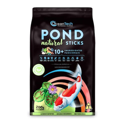 Ração Ocean Pond Natural Sticks 200g Ocean tech Pond Natural Sticks é um alimento completo na forma de sticks flutuantes para o uso diário, feito com ingredientes Premium com qualidade e quantidade adequada de proteínas de alta digestibilidade, vitaminas, aminoácidos, minerais, prebióticos, probióticos e carotenoides naturais para um crescimento saudável e cores vibrantes. É produzido com ingredientes naturais e totalmente livre de conservantes e corantes artificiais, mantendo a saúde da sua carpa. Pond Natural Sticks um alimento ideal para carpas jovens e adultas.