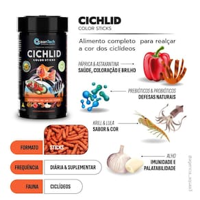 Ração Ocean Tech Cichlid Color Sticks 300g Ração OceanTech Cichlid Color Sticks 300g - realce natural das cores e nutrição completa para ciclídeos