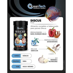 Ração OceanTech Discus Food Aracá Disco e Bandeira 200g - alimento premium para peixes exigentes - Mega Aquários Validade: produto com validade longa Fabricado no Brasil A OceanTech Discus Food é uma ração premium em grânulos desenvolvida especialmente para acarás discos, peixes bandeira e outras espécies ornamentais exigentes. Sua fórmula balanceada contém proteínas de alto valor biológico e ingredientes funcionais que garantem o desenvolvimento saudável, coloração intensa e vitalidade dos peixes. Ingredientes selecionados: Farinha de peixe, farinha de camarão, farinha de , krill, alga kelp rica em fucoidan, óleo de salmão, páprica, astaxantina, alho e zeólita. Essa combinação exclusiva promove uma alimentação completa e altamente nutritiva. Benefícios principais: Alta digestibilidade com grânulos flutuantes que evitam o acúmulo de resíduos Realce natural das cores com carotenoides, páprica e astaxantina Crescimento saudável com aminoácidos essenciais e proteínas nobres Reforço da imunidade com alho e antioxidantes naturais Melhora da qualidade da água graças à ação purificante da zeólita Saúde da pele e das nadadeiras com óleo de salmão rico em ômega-3 Ingredientes funcionais que favorecem o equilíbrio do sistema digestivo Características: Ração premium fabricada no Brasil Granulada - ideal para acarás discos e peixes ornamentais Alta concentração de proteínas e nutrientes Sem corantes ou conservantes artificiais Crescimento acelerado e coloração vibrante Indicado para uso diário Ingredientes funcionais para saúde e longevidade dos peixes Compre nesse anúncio com segurança: Mega Aquários é revendedor oficial autorizado OceanTech. Especificações: Marca: OceanTech Revendedor oficial: Mega Aquários Modelo: Discus Food Peso líquido: 200g Modo de uso: Ofereça a OceanTech Discus Food de duas a três vezes ao dia, em porções que possam ser consumidas em poucos minutos. Ajuste a quantidade conforme o comportamento alimentar dos peixes e a temperatura da água. Evite excessos para manter os parâmetros do aquário estáveis. Obrigado pela visita e boas compras ATENÇÃO Nossas imagens e textos são registrados e com direito de uso autoral controlado e reservado a essa loja e as lojas parceiras devidamente autorizadas em contrato. Marca: Não Informado
