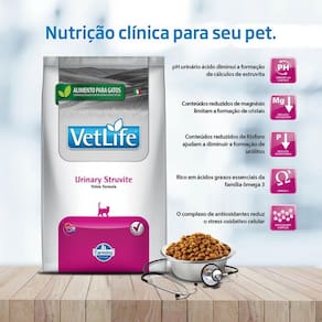 Farmina Vet Life Natural Feline Urinary Struvite é um alimento coadjuvante seco indicado para gatos com distúrbios urinários provocados pela formação de cálculos à base de estruvita. As baixas concentrações de fósforo e magnésio associados ao pH urinário ácido geram um ambiente desfavorável para a agregação e precipitação de cristais e para a proliferação bacteriana - Benefícios 100% Livre de Ingredientes Geneticamente Modificados: de uma nutrição natural e de alta qualidade Controle do pH Urinário: A formulação mantém um pH urinário ácido, o que diminui a formação de cálculos de estruvita, promovendo a saúde urinária. Redução de Magnésio e Fósforo: Contém baixos níveis de magnésio e fósforo, o que ajuda a limitar a formação de cristais e urólitos, contribuindo para um sistema urinário saudável. Ômega-3 e Complexo Antioxidante: É rico em ácidos graxos essenciais da família ômega-3, que oferecem benefícios anti-inflamatórios, e inclui um complexo de antioxidantes que reduz o oxidativo celular. *RESTRIÇÕES E OUTRAS RECOMENDAÇÕES: Vet Life Natural Feline Urinary Struvite é contraindicada para filhotes, gatas em gestação ou lactação e gatos com acidose metabólica. Marca: Não Informado