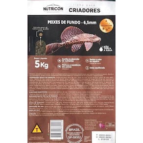 Ração Peixes Fundo Bottom Fish 6,5Mm Criadores Nutricon 5KgRação Peixes de Fundo - bottom fish - 6,5 mm Linha para Criadores Nutricon 5kgA ração Peixes de Fundo Linha para Criadores da Nutricon foi criada especialmente para uma alimentação equilibrada de peixes e invertebrados que habitam o fundo de áquário e lago e que possuem hábito alimentar noturnoIdeal para manutenção de Botias, Cascudos, Corydoras, Limpa Vidros entre outrosNão turva a águaFácil absorção de nutrientes - probióticoMelhora a resistência dos peixes - vitamina CReduz o odor do aquário - Extrato de YuccaAlta digestibilidadeGrãos com diâmetro aproximado de 6,5 mm e 4 mm de espessura