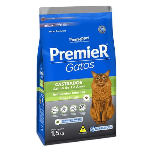 PremieR Gatos Castrados acima de 12 anos ? Frango é um alimento Super Premium que faz parte da linha PremieR Gatos Castrados, uma linha de alimentos especialmente desenvolvida para garantir o máximo em saúde e vitalidade aos gatos através de cuidados nutricionais específicos pós castração.