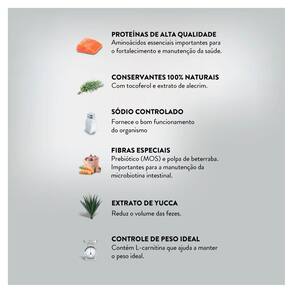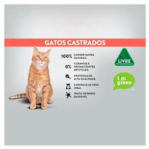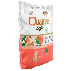 A Ração Seca Quatree Life Salmão e Arroz Gatos Castrados foi desenvolvida com o objetivo de proporcionar uma alimentação mais saudável para os gatos castrados, com baixa atividade física ou que vivem em ambientes internos. É um alimento Premium Especial livre de transgênicos e formulado com conservantes 100% naturais para promover uma nutrição equilibrada. Contém fibras especiais que auxiliam na redução da formação de bolas de pelos, e prebiótico (MOS), que otimiza a absorção dos nutrientes, melhorando a consistência e atenuando o odor das fezes. Possui fontes de proteínas selecionadas e nutrientes essenciais para atender as necessidades do seu gato. É enriquecido com L-carnitina, importante no metabolismo da gordura e no controle de ganho de peso.