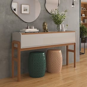 Produzido em MDP de alta durabilidade com laterais arredondadas em MDF de 15 mm. Pés e puxadores feitos de madeira maciça para maior estabilidade e sofisticação. Possui 2 gavetas espaçosas para armazenar objetos Elegance