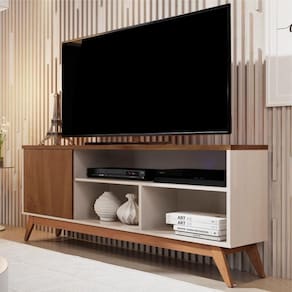 Desenvolvido em MDP E MDF, o Rack possui pés em MADEIRA, tampo de 25mm, com maior durabilidade e acabamento amadeirado Touch.