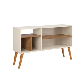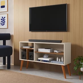 Seus pés palito inclinados conferem um toque retrô e garantem estabilidade, enquanto os nichos abertos com prateleiras oferecem espaço ideal para acomodar eletrônicos, livros, objetos decorativos ou itens do dia a dia. Compacto e versátil, é a escolha ideal para quem busca estilo e organização em um só produto.