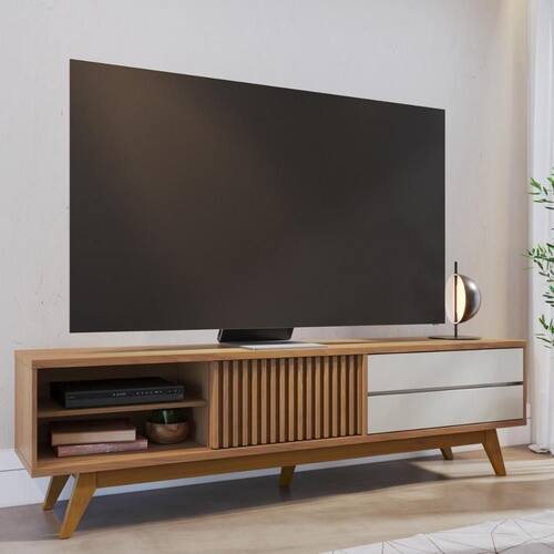 A Bancada Veneza combina estilo contemporâneo e funcionalidade para criar um ambiente sofisticado e prático. Com cinco pés de madeira maciça e travas em MDF, a peça oferece estabilidade e elegância. Destacando-se pelos detalhes, possui duas gavetas com corrediças telescópicas, uma porta deslizante ripada que confere volumetria e uma prateleira para aparelhos eletrônicos. A base e o tampo de 25mm garantem robustez e durabilidade. Escolha a Bancada Veneza para transformar sua sala em um espaço refinado e organizado.