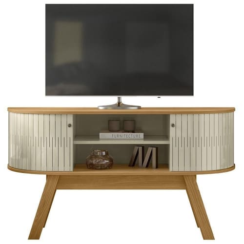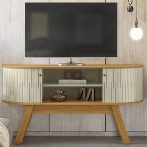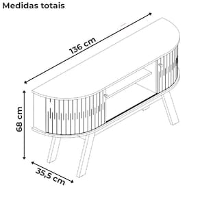 Rack para Atlanta, criada para compor no seu ambiente com um design leve, pés estilo retrô e portas de correr curvas. Estrutura em MDP 15/25 mm, suporta TVs de até 55 pol com . Assim como o tampo, sua base possui bordas arredondadas, 2 portas de correr íveis (em MDF), com sistema de abertura em trilho plástico, detalhes com frisos vazados e puxadores plásticos, além de 1 prateleira central (com capacidade para até 2 kg) e 4 pés em MDP 25mm estilo retrô. Acabamento em pintura UV texturizada fosca e brilho. Este móvel chegará em sua casa separado em 01 volume.