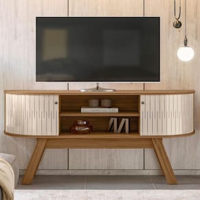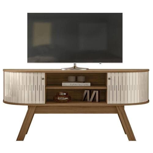 Rack para Atlanta, criada para compor no seu ambiente com um design leve, pés estilo retrô e portas de correr curvas. Estrutura em MDP 15/25 mm, suporta TVs de até 55 pol com . Assim como o tampo, sua base possui bordas arredondadas, 2 portas de correr íveis (em MDF), com sistema de abertura em trilho plástico, detalhes com frisos vazados e puxadores plásticos, além de 1 prateleira central (com capacidade para até 2 kg) e 4 pés em MDP 25mm estilo retrô. Acabamento em pintura UV texturizada fosca e brilho. Este móvel chegará em sua casa separado em 01 volume.
