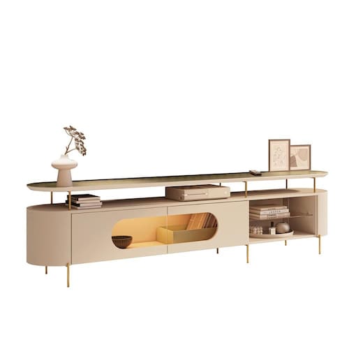 Conta com nichos abertos, prateleira elevada e iluminação interna, perfeita para destacar objetos decorativos.
