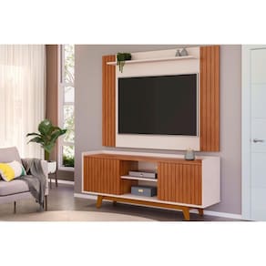 Rack Bancada c/ Painel p/ TV até 55 Pol Trend/Flat Ripado Portas e Nichos 150x168cm Freijó/Off White - DJ Móveis