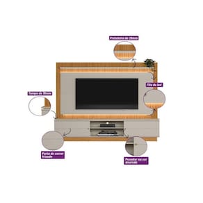 Tipo de Porta - Portas de Correr Material do Trilho da Porta de Correr - Trilho Metálico Quantidade de Portas - 2 Portas de Correr Tipo de Iluminação - Iluminação Fita LED Tipo de Puxador - Alumínio Material das Prateleiras - Prateleira Madeirada Quantidade de Prateleiras - 2 Prateleiras Quantidade de nichos - 2 Nichos Ideal para TVs até (Polegadas) - 75 Tipo dos Pés - Pés em ABS/PVC Quantidade de Pés - Móvel possui 8 pés
