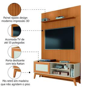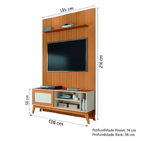 O Conjunto Rack Bancada Caribe com Painel Egeo é a definição de elegância e sofisticação! Conta com espaço para aparelhos eletrônicos, prateleiras, 1 porta deslizante com amplo espaço interno e acabamento em tela Rattan sintética, painel com detalhe ripado em impressão 3D e rack com pés resistentes de madeira. Feito com materiais de qualidade garantindo maior resistência e durabilidade. Acomoda TV de até 55 polegadas. MEDIDAS PAINEL: [ A ] = 216 cm [ L ] = 135 cm [ P ] = 14 cm MEDIDAS PRATELEIRA: [ L ] = 110 cm [ P ] = 14 cm MEDIDAS RACK: [ A ] = 58 cm [ L ] = 136 cm [ P ] = 36 cm MEDIDAS DOS PÉS: [ A ] = 22 cm [ L ] = 6,5 cm [ P ] = 2,5 cm ACOMODA TV ATÉ: 55 polegadas PESO DO PAINEL: 34 Kg PESO SUPORTADO PELO PAINEL: 50 Kg PESO DO RACK: 21,4 Kg PESO SUPORTADO PELO RACK: 30 Kg MODELO: Rack Bancada Caribe Com Painel Para TV Até 55 Polegadas 1,35m Egeo Ripado Impressão 3D COR: Cedro/Off White MARCA: EDN ACABAMENTO: Pintura UV MATERIAL DO PAINEL: MDP MATERIAL DO RACK: MDF ESPESSURA DO MATERIAL DA ESTRUTURA: 12 e 15mm PORTAS: 1 TIPO DE PORTA: Correr PRATELEIRAS: 2 PÉS: 4 MATERIAL DOS PÉS: MDF GARANTIA: 3 meses pelo fabricante DIFERENCIAL: Tampo do Rack em MDF com borda laqueada, acabamento do painel em ripado impressão 3D, portas deslizantes com acabamento em moldura e tela Rattan sintética, prateleiras, trilhos em ABS, produto acomoda TV e objetos decorativos. ITENS INCLUSOS: 1 Rack Bancada, 1 Painel, 1 manual de Montagem e 1 Kit de ferragens INSTRUÇÕES/CUIDADOS: Para maior durabilidade, recomendável que a limpeza dos móveis seja feita com pano limpo e levemente umedecido em água e sabão neutro. Em seguida, deverá ser passado um pano limpo e seco. A Esplanada Móveis se responsabiliza pela entrega dos produtos adquiridos até a porta de entrada ou portaria do endereço indicado, se a portaria do condomínio permitir, as entregas são efetuadas no piso térreo e é de responsabilidade do cliente a locomoção da mercadoria até seu apartamento ou casa.