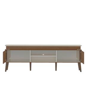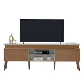 Suporta TVs de até 75 polegadas, possui duas portas com fecho-toque, nichos para eletrônicos e pés de madeira maciça, garantindo organização e estilo. Seu acabamento premium combina texturas e brilho, se adaptando perfeitamente à sua decoração.