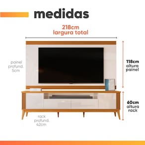 MEDIDAS BANCADA: A = 60 cm L = 218 cm P = 42 cm MEDIDAS NICHO BANCADA: A = 18 cm L = 121,4 cm MEDIDA PÉS BANCADA: A = 20 cm MEDIDAS PAINEL: A = 118 cm L = 218 cm P = 5 cm GAVETAS SUPORTAM ATÉ: 4 kg NICHO SUPORTA ATÉ: 4 kg BANCADA SUPORTA ATÉ: 30 kg PESO BANCADA: 42 kg PAINEL SUPORTA ATÉ: 35 kg PESO PAINEL: 35 kg IDEAIS PARA TV DE ATÉ: 75 Polegadas MODELO: Rack Bancada com Painel Detalhe Ripado Vetro Para TV Até 75 Polegadas 2,18m MARCA: EDN Móveis COR: Madeirado/Off White PINTURA: Pintura UV de alta qualidade ACABAMENTO: Semi brilho / fosco MATERIAL DA ESTRUTURA: MDF/MDP ESPESSURA DA ESTRATURA: 15 e 25mm PORTAS: 2 TIPO DE PORTA: Bater DOBRADIÇAS: Pressão PUXADORES: Cava GAVETAS: 2 CORREDIÇAS: Telescópicas NICHOS: 1 PÉS: 6 MATERIAL DOS PÉS: Madeira maciça DIFERENCIAIS: Design moderno e elegante com detalhes ripado / 2 Gavetas com corrediças telescópicas / Pés bancada em madeira maciça / Suportam TV de até 75". ITENS INCLUSOS: 1 painel, 1 rack bancada, 1 manual de montagem, 1 kit parafusos INSTRUÇÕES E CUIDADOS: Para maior durabilidade, recomendável que a limpeza dos móveis seja feita com pano limpo e seco. Não usar produtos químicos ou abrasivos. GARANTIA: 3 meses pelo fabricante.