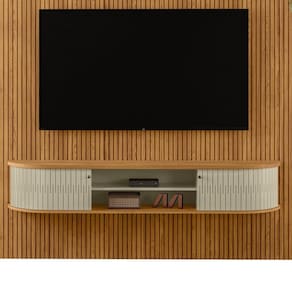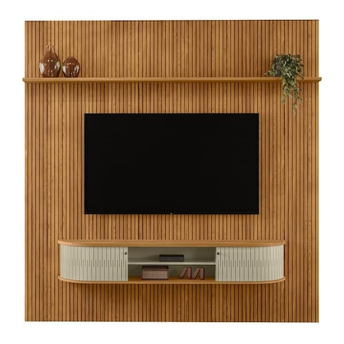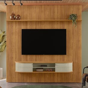 O Rack Bancada com Painel New Bugatti é a combinação do Painel New Guaporé e o Rack Suspenso Algarve, ideal para quem busca inovação na decoração da sala. O Painel Piso-Teto New Guaporé, em MDF e MDP com pintura UV, possui design frisado, prateleira superior e fixação na parede, garantindo um visual moderno e elegante, ideal para TV até 75. Já o Rack Suspenso Algarve é ideal para quem busca sofisticação e inovação. Com suas portas flexíveis em MDF, oferece praticidade e um acabamento sofisticado. A porta curva é um diferencial exclusivo da Madetec, garantindo autenticidade. Inspirado no design europeu, possui detalhes curvos no tampo e na base, além dos puxadores em bronze que combinam perfeitamente com seu design.
