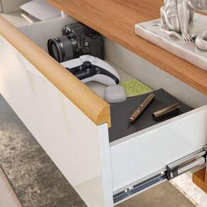 - Informações Adicionais: Rack: Puxadores em madeira maciça, Cantoneira em madeira maciça, Gavetas com corrediças telescópicas ; Painel: Prateleiras com leds