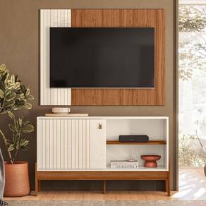 Rack Bancada Com Painel Wood 120cm Pérola Metalizado/cinamomo Mel Para Até 42 - Mobler Pérola Metalizado/cinamomo Mel