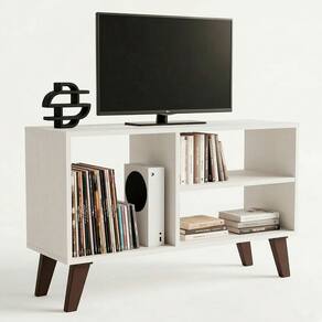 Seu design compacto e multifuncional permite acomodar TV de até 40 polegadas, além de organizar eletrônicos, livros e objetos decorativos com praticidade. O fundo vazado facilita a passagem de cabos e contribui para melhor ventilação dos aparelhos.