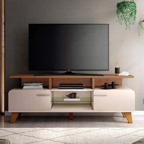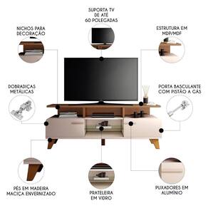 Seus cantos arredondados conferem um toque de suavidade e elegância, ideal para acomodar uma de até 60 polegadas sobre a sua base ampla e resistente. Além disso, abaixo, uma prateleira de vidro de 6mm conta com espaço para os eletrônicos. A Bancada Para Sala possui duas portas basculantes com pistão a gás, que facilitam a abertura e o fechamento, além de garantir um espaço interno otimizado para guardar objetos e acessórios. Os puxadores metálicos em tom dourado contrastam com a cor neutra da bancada, criando um efeito visual de requinte e harmonia. Os pés de madeira maciça, com acabamento envernizado, proporcionam estabilidade e durabilidade ao Rack Para Sala, que é produzido em MDP e MDF de alta qualidade e ecologicamente corretos. Esta bancada é uma ótima opção para quem busca um móvel funcional, bonito e versátil para a sua Sala De Estar.
