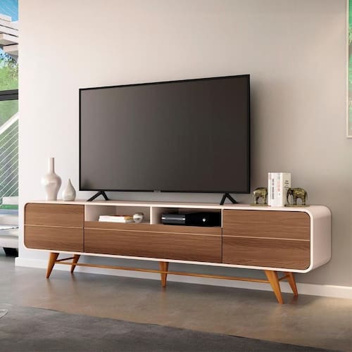Além da funcionalidade, com capacidade para acomodar TVs de até 85 polegadas, esse rack ainda conta com cantos arredondados e filetes decorativos nas portas. Já os pés em madeira maciça torneados dão um charme adicional. Para completar, essa Bancada possui três portas espaçosas, que oferecem amplo espaço de armazenamento para os mais diversos itens, enquanto os nichos centrais são ótimas opções para instalar os demais aparelhos eletrônicos. Com esse móvel, você terá funcionalidade e estilo tornando seu Ambiente Moderno. Adicione charme e organização a sua sala com esse Rack Para .