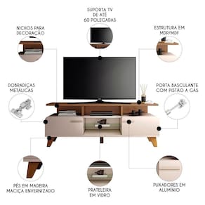 Seus cantos arredondados conferem um toque de suavidade e elegância, ideal para acomodar uma TV de até 60 polegadas sobre a sua base ampla e resistente. Além disso, abaixo, uma prateleira de vidro de 6mm conta com espaço para os eletrônicos. A Bancada Para Sala possui duas portas basculantes com pistão a gás, que facilitam a abertura e o fechamento, além de garantir um espaço interno otimizado para guardar objetos e acessórios. Os puxadores metálicos em tom dourado contrastam com a cor neutra da bancada, criando um efeito visual de requinte e harmonia. Os pés de madeira maciça, com acabamento envernizado, proporcionam estabilidade e durabilidade ao Rack Para Sala, que é produzido em MDP e MDF de alta qualidade e ecologicamente corretos. Esta bancada é uma ótima opção para quem busca um móvel funcional, bonito e versátil para a sua Sala De Estar.