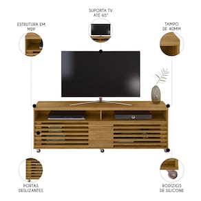 Com um design elegante e estrutura bem planejada, o Rack Para TV acomoda até 65 polegadas e proporciona um espaço organizado para seus aparelhos eletrônicos e itens decorativos. Destaque para as portas deslizantes, que permitem ocultar ou exibir os objetos conforme sua necessidade, mantendo o ambiente sempre arrumado. Além disso, os rodízios de silicone facilitam a movimentação do móvel, tornando a limpeza mais prática e protegendo o piso contra riscos. O tampo resistente reforça a durabilidade do Rack, enquanto os nichos espaçosos oferecem praticidade para organizar acessórios, livros e outros itens essenciais.