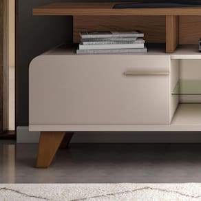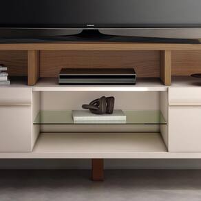 O Rack Bancada Essenza combina sofisticação e funcionalidade para deixar sua sala de estar ainda mais elegante. Com estrutura em MDF e MDP de 25mm e 15mm, possui pintura UV que garante um acabamento refinado e durabilidade. Seu design conta com cantos arredondados e puxadores metálicos em tom dourado, adicionando um toque de requinte ao ambiente. Conta com duas portas basculantes equipadas com pistão a gás e dobradiças metálicas, proporcionando praticidade no dia a dia. A prateleira de vidro de 6mm permite organizar seus aparelhos com moda. O tampo em MDP de 25mm suporta até 50kg distribuídos, garantindo para sua e demais itens decorativos. Os pés de madeira maciça com acabamento envernizado completam o visual sofisticado e é ideal para até 60.