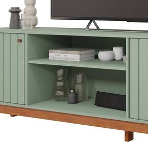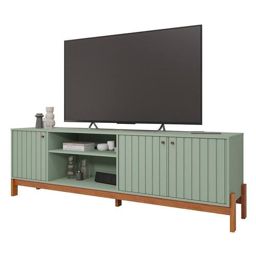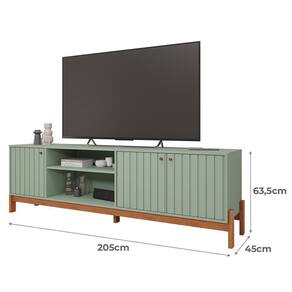 Rack Bancada Holanda 205cm Sálvia/cinamomo Para Até 70 - Permóbili Sálvia/cinamomo Rack Bancada Holanda 205cm para até 70 - Permóbili Transforme sua sala de estar com o Rack Bancada Holanda 2055cm. Com 3 portas com dobradiças em slow motion, garantindo um fechamento suave e detalhes em efeito 3D ripado, que adicionam um toque sofisticado ao design. Os puxadores na cor cobre complementam a estética moderna, enquanto os pés em MDF apresentam estabilidade e modernidade. Transforme seu ambiente com funcionalidade e design. ESPECIFICAÇÕES: - Estrutura em MDF - Pintura UV - 3 Portas - Dobradiças slow motion - Detalhe nas portas com efeito 3D ripado - Puxadores na cor cobre - Prateleira - Pés em MDF - Ideal para até 70