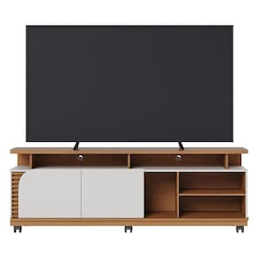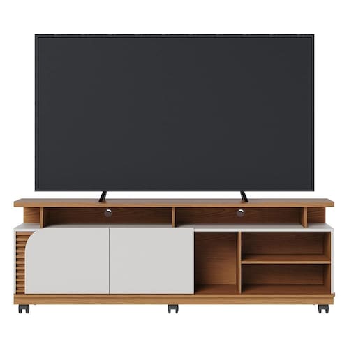 ESPECIFICAÇÕES: Estrutura em MDP 25mm, 15mm e 12mm, MDF 15mm e HDF 3mm Pintura UV 2 Portas Dobradiças metálicas Detalhe ripado Porta, tampo e base com cantos curvos Nichos espaçosos Tampo de 25mm Rodízios de plástico Ideal para TV até 75