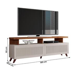 Modelo: Rack Bancada Londres; Material da estrutura: MDP 12mm, MDP 15mm, MDP 25mm, MDF 03mm; Dimensões: 160,4 cm (L) x 60,2 cm(A) x 37,3 cm(P); Tamanho máximo de TV: até 65” Polegadas; Espaço para TV: 180 cm(L) x 38,5 cm(P); Quantidade de portas: 02 com recorte ripado (dobradiças metálicas com pistão a gás); Com puxador: Não se aplica; Quantidade prateleiras: não se aplica; Com nichos: 02; Com rodízios: Não; Com pés: sim, em plásticos; Peso suportado: até 00 kg distribuídos; Requer montagem: Sim (kit montagem incluso);