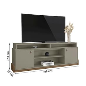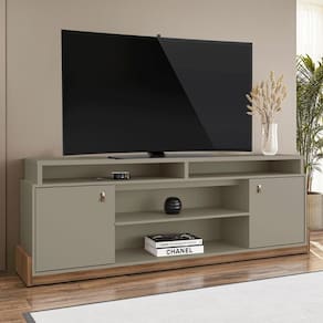 Comporta TVs de até 75 e traz design moderno com nichos amplos, 2 portas com puxadores elegantes e rodízios embutidos que facilitam a movimentação.