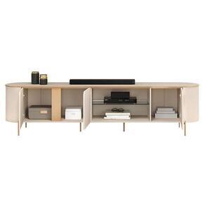 Está montado a sua sala? Apresentamos para você este belo rack da linha Ariana. Apresenta bordas arredondadas e três portas com cantos curvos, dando um visual moderno e suave. Possuindo uma prateleira em vidro para acomodar seus aparelhos eletrônicos, além dos pés em metal na cor dourado, garantindo charme e resistência. Fabricado pela DJ Móveis, é desenvolvido em 100% MDF proveniente de madeira de reflorestamento. Com capacidade para TVs de até 75 polegadas, será a escolha perfeita para compor seu ambiente com mais sofisticação e organização. Confira e aproveite!