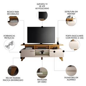 Seus cantos arredondados conferem um toque de suavidade e elegância, ideal para acomodar uma TV de até 60 polegadas sobre a sua base ampla e resistente. Além disso, abaixo, uma prateleira de vidro de 6mm conta com espaço para os eletrônicos. A Bancada Para Sala possui duas portas basculantes com pistão a gás, que facilitam a abertura e o fechamento, além de garantir um espaço interno otimizado para guardar objetos e acessórios. Os puxadores metálicos em tom dourado contrastam com a cor neutra da bancada, criando um efeito visual de requinte e harmonia. Os pés de madeira maciça, com acabamento envernizado, proporcionam estabilidade e durabilidade ao Rack Para Sala, que é produzido em MDP e MDF de alta qualidade e ecologicamente corretos. Esta bancada é uma ótima opção para quem busca um móvel funcional, bonito e versátil para a sua Sala De Estar.
