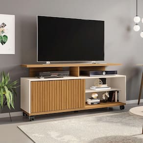 Sala de Estar mais aconchegante e funcional! Ele possui 1 porta deslizante com detalhes modernos, 3 nichos para aparelhos eletrônicos ou objetos decorativos e suporta TV de até 52 Polegadas. Ah, e ainda conta com rodízios que facilitam a locomoção e limpeza!