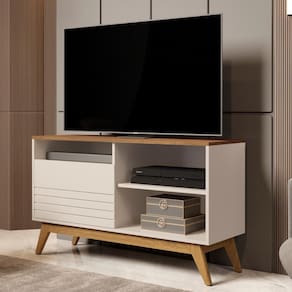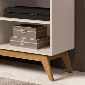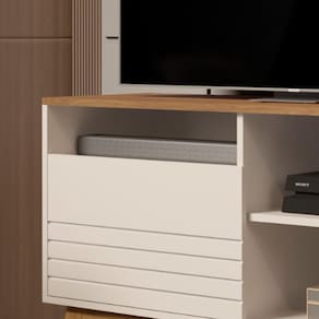 O móvel possui uma porta com dobradiça metálica, oferecendo um espaço interno amplo para guardar seus aparelhos e acessórios, mantendo tudo organizado e protegido. Além disso, ele conta com uma prateleira e nichos, que podem ser utilizados para acomodarem livros e outros objetos decorativos.