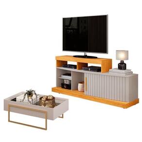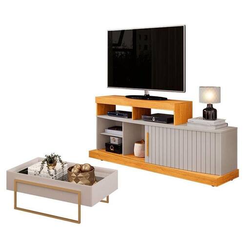 Começou a montar sua sala? Apresentamos para você este belo rack da linha Scala e a mesa de centro da linha Pilar. Apresentando um design moderno com linhas curvas, conta com uma porta com frisos deslizante, cinco nichos para acomodar seus aparelhos eletrônicos e objetos decorativos, além do puxador em MDF. Os rodízios ocultos facilitam a movimentação, mantendo a estética elegante. A mesa de centro complementa o conjunto. O tampo com espelho aplicado e as laterais chanfradas reforçam o acabamento refinado. Os pés em metal na cor dourado valoriza o detalhe. Fabricados pela DJ Móveis, são desenvolvidos em MDP/ MDF proveniente de madeira de reflorestamento, garantindo durabilidade, qualidade e respeito ao meio ambiente. Com esse conjunto, seu ambiente ganha luxo e um toque de modernidade, valorizando cada detalhe. Confira e aproveite!