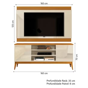 DIFERENCIAL: Prateleiras e nichos para acomodar aparelhos eletrônicos e objetos decorativos, pés estilo retrô em madeira, portas articuladas com puxadores no estilo cava, painel com acabamento semi fosco