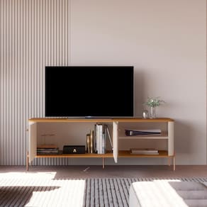 Produzido em MDF 15mm com pés em metal, suporta TVs de até 60 com segurança.