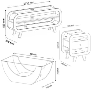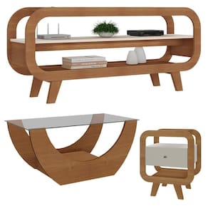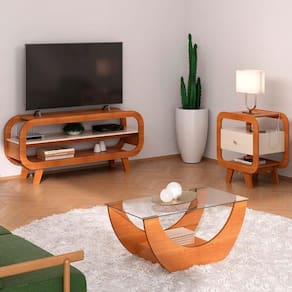 Design e funcionalidade, esse trio é a escolha certa para compor salas com personalidade. O rack de 133 cm une design moderno com bordas curvas, estrutura em MDF 15mm (pés de 25mm), suportando TVs de até 42 polegadas e com 2 prateleiras abertas. A mesa de apoio é feita em MDP 15mm (pés em MDF 25mm), conta com acessório porta USB tipo-A e tipo-C integradas com cabeamento pronto para uso e uma gaveta com corrediças metálicas, além de ser versátil o suficiente pra funcionar como mesa de cabeceira. Finalizando o trio, a mesa de centro traz base curva em MDP 15mm e tampo em vidro temperado de 5mm, garantindo um toque moderno com suas bordas curvas. Todo o conjunto tem acabamento em Tintura UV para melhor durabilidade. Três peças para uma sala com mais estilo e personalidade. Este conjunto chegará em sua casa separado em 04 volumes.