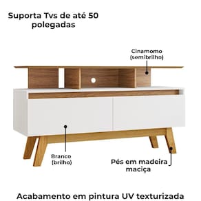 MDP/MDFRack Bancada Rubi, um móvel que valoriza o ambiente com design funcional e detalhes marcantes. Estrutura em MDP/MDF (15/12mm) com acabamento em pintura UV texturizada. Possui portas basculantes com dobradiças metálicas, detalhes chanfrados, nichos decorativos funcionais, passa-fios e pés em madeira maciça (Pinus). Suporta TVs de até 50 polegadas com segurança. Este produto será entregue em 1 volume.