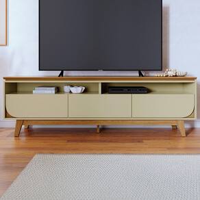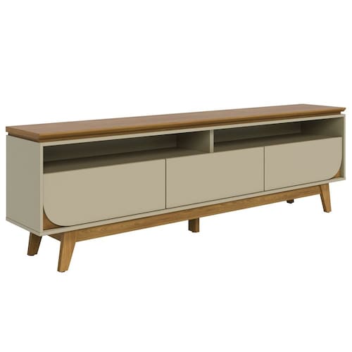 Rack Bancada Selene, com design funcional e detalhes usinados que transformam o ambiente. Estrutura em MDP 15/25 mm, (base 15mm e tampo/rodapés/pés em 25mm) suportando TVs de até 75 polegadas com segurança (TV NÃO INCLUSA). Conta com tampo suspenso com bordas chanfrada, 3 gavetas com corrediças telescópicas (gavetas laterais com frente em detalhe curvo) e puxadores tipo cava, 2 nichos centrais, passa-fios e 4 pés usinados com sapatas plásticas. Acabamento em pintura UV texturizada (fosco e brilho). Este móvel será entregue em 02 volumes.
