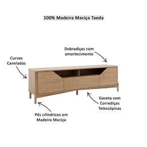 Características: Estrutura em Madeira Maciça de Pinus Taeda de Reflorestamento Pintura semi-brilho 02 Portas com dobradiças com amortecimento 01 Gaveta com corrediças telescópicas Puxadores cava Curvas caneladas Pés cilindricos Peso máximo suportado pela Gaveta: 05kg distribuídos Peso maximo suportado pelo Tampo: 30Kg distribuidos Peso maximo suportado pela Prateleira: 10kg distribuídos Ideal para TV até 80 polegadas *NÃO ACOMPANHA TV*